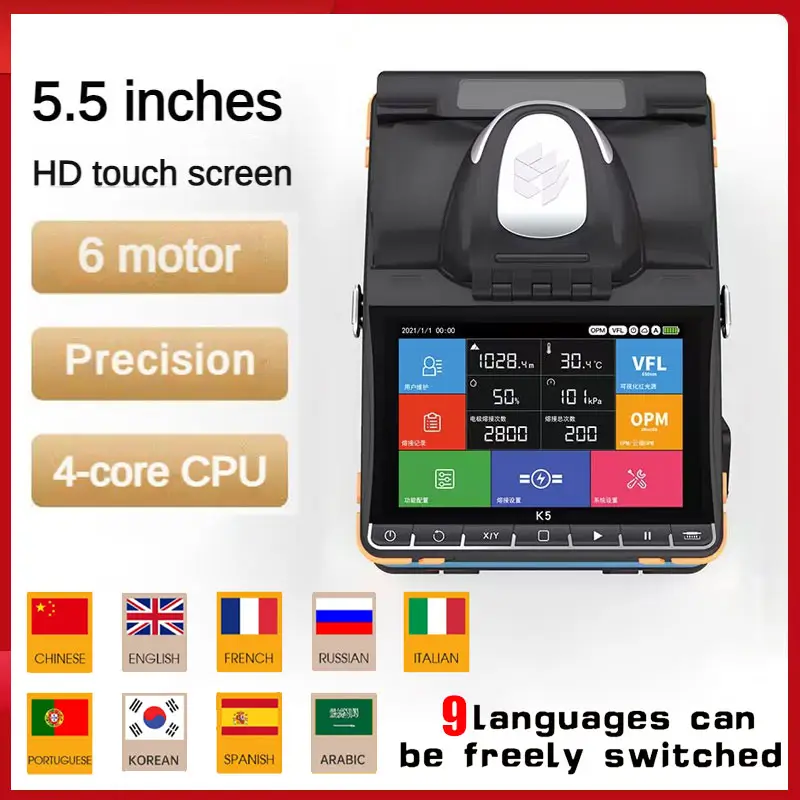 A new generation of intelligent fully automatic fiber fusion splicer with six motor fiber core alignment technology and automatic focusing 5.5 inch high-definition touch screen with beautiful GUI graphical operation interface 7800mA high capacity lithium battery with built-in optical power meter and red light pen function Fully competent in FTTH home entry, security monitoring and other fiber optic cable fusion projects, comparable to imported high-end models