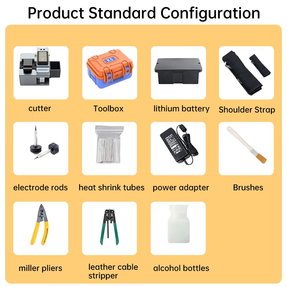 A new generation of intelligent fully automatic fiber fusion splicer with six motor fiber core alignment technology and automatic focusing 5.5 inch high-definition touch screen with beautiful GUI graphical operation interface 7800mA high capacity lithium battery with built-in optical power meter and red light pen function Fully competent in FTTH home entry, security monitoring and other fiber optic cable fusion projects, comparable to imported high-end models